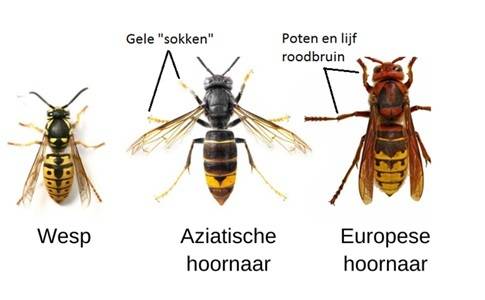 In Nederland leven de Europese hoornaar en de Aziatische hoornaar. De Europese hoornaar hoort thuis in Nederland en vormt geen gevaar voor de biodiversiteit. Deze hoornaar is ongeveer 3,5 centimeter lang en heeft bruine poten en een geel en bruin lijf. De Aziatische hoornaar is iets kleiner, namelijk zo’n 2,5 centimeter lang. Ook heeft deze hoornaar een geel met zwart lijfje en heeft hij gele “sokken” aan.