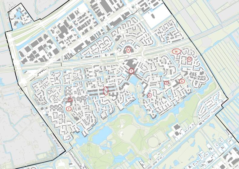 Aan de hand van allerlei gegevens rondom hittestress en wateroverlast hebben we enkele mogelijke locaties ingetekend. Vervolgens zijn we met het WOP in gesprek gegaan en hebben we partijen als Havensteder, de stadsmarinier, Sportief Capelle en de Wijkregisseur gevraagd naar hun ideeën. Dat samen heeft de tot volgende kaart met mogelijke locaties geleid.