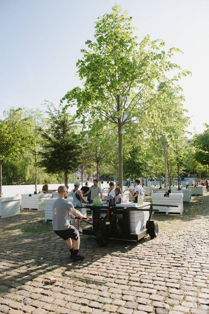 Elke paar maanden verplaatsen we het bos met speciale steekwagens naar een nieuwe locatie. Dit verplaatsen is een activiteit op zich. Elke boom kan met ongeveer 3 mensen goed verplaatst worden. Dus samen met omwonenden zullen we op de dag van verplaatsen met 4 bomen per keer door de stad “wandelen” naar de volgende locatie.