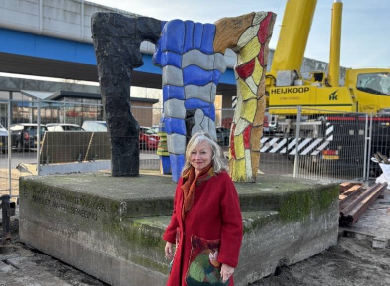 Het was een bijzondere ochtend op het Amnestyplein in Capelle aan den IJssel. Het kunstwerk Amnesty International van kunstenaar Petri Voet krijgt een nieuwe plek. De houten vlonder die deel uitmaakt van de nieuwe inrichting van het plein, wordt hier opgebouwd. Daarom werd het kunstwerk met een grote kraan een stukje verplaatst. Mevrouw Voet keek toe hoe haar werk van 19 ton werd getild en op de drie heipalen werd verplaatst.